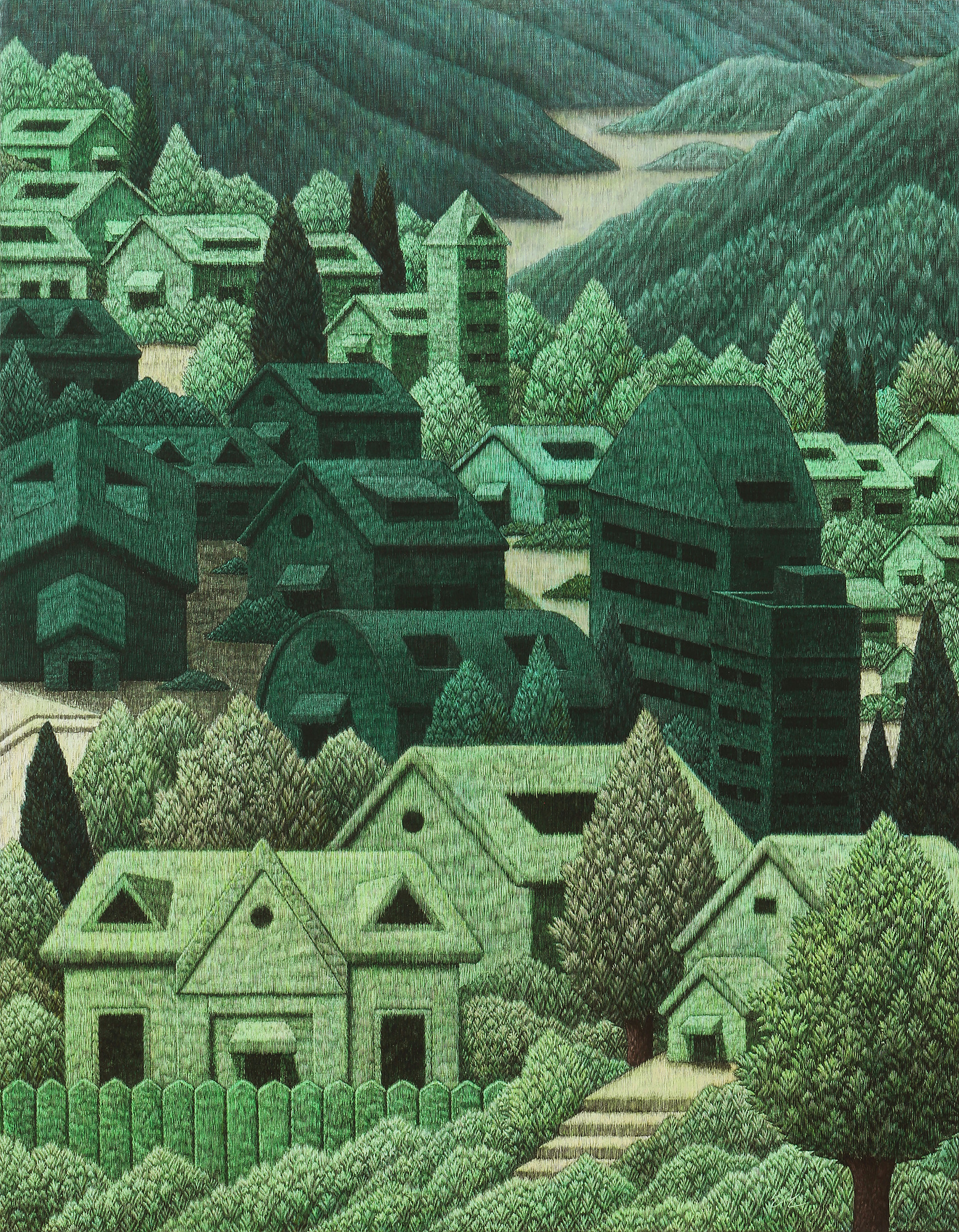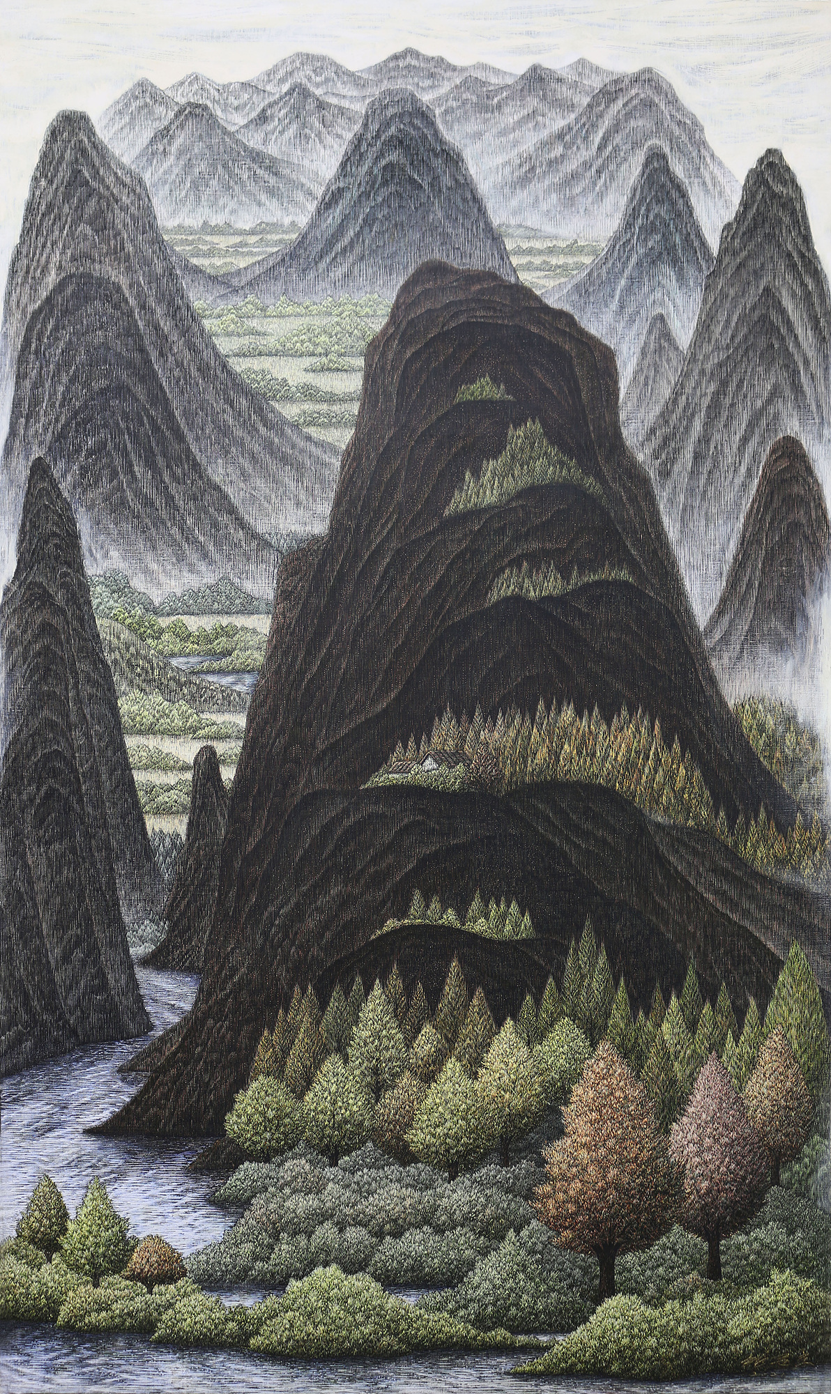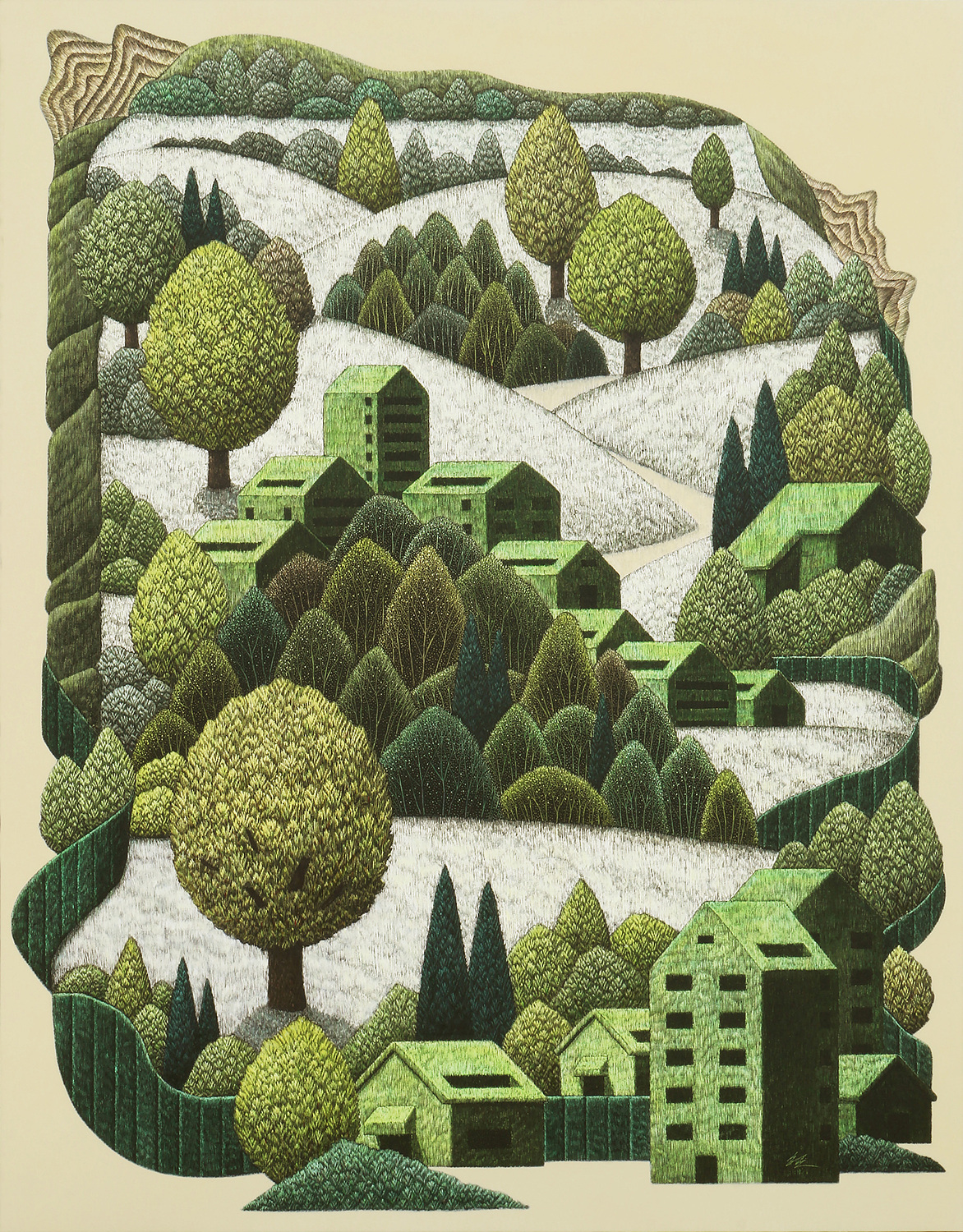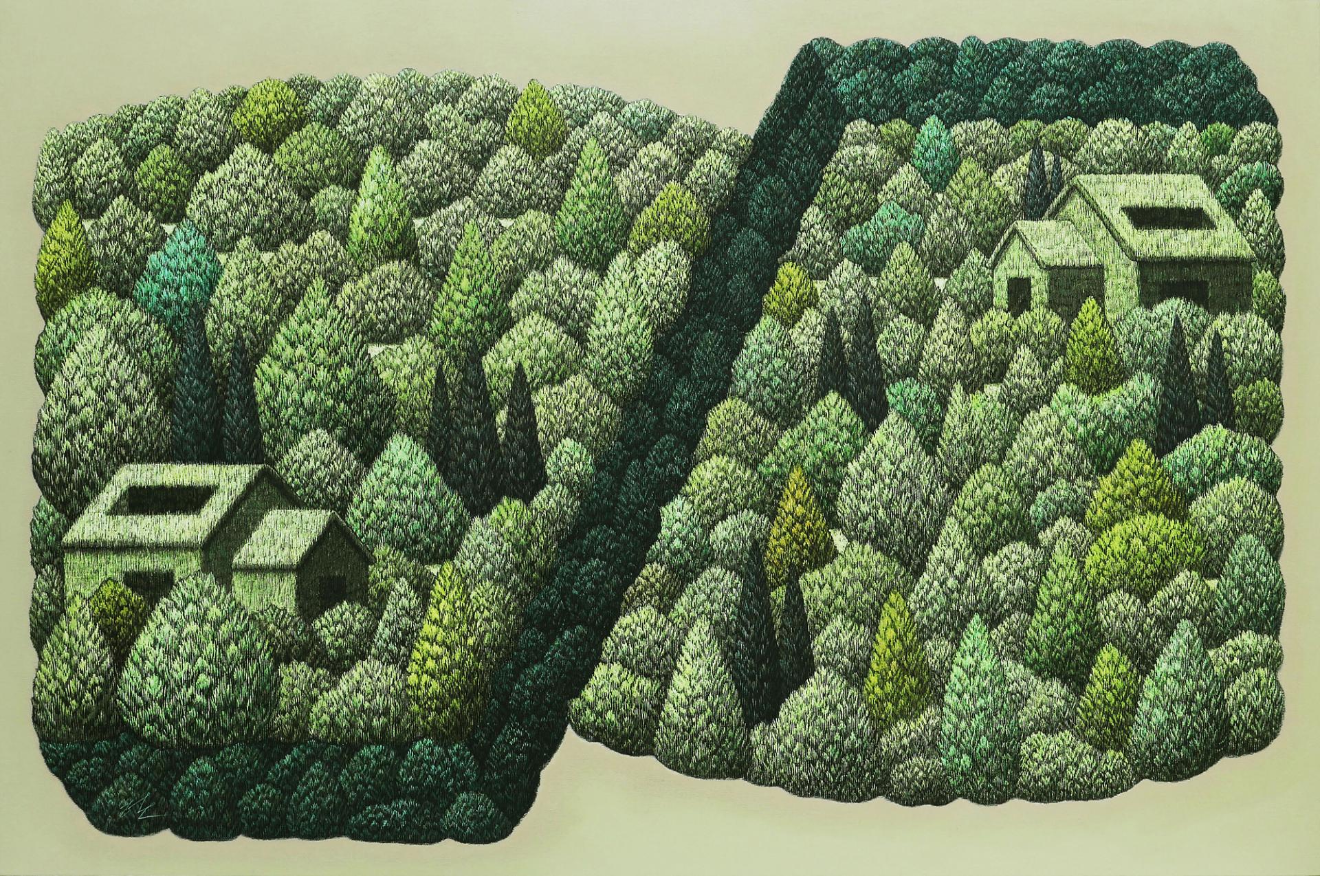 도시의 회색빛 틈새에서 우리는 종종 초록의 기억을 더듬는다. 한준호의 작품은 그 잊힌 기억의 잔영을 되살리는 행위의 결과다. 날카로운 피스칼로 긁어내는 수많은 선의 결은 단순한 묘사가 아니라, 자연을 향한 회복의 주문이자 치유의 언어다. 그의 화면 속 숲은 ‘본 적은 없지만 그리운 장소’로 남아, 인간의 내면에 잠들어 있던 생명 감각을 일깨운다.