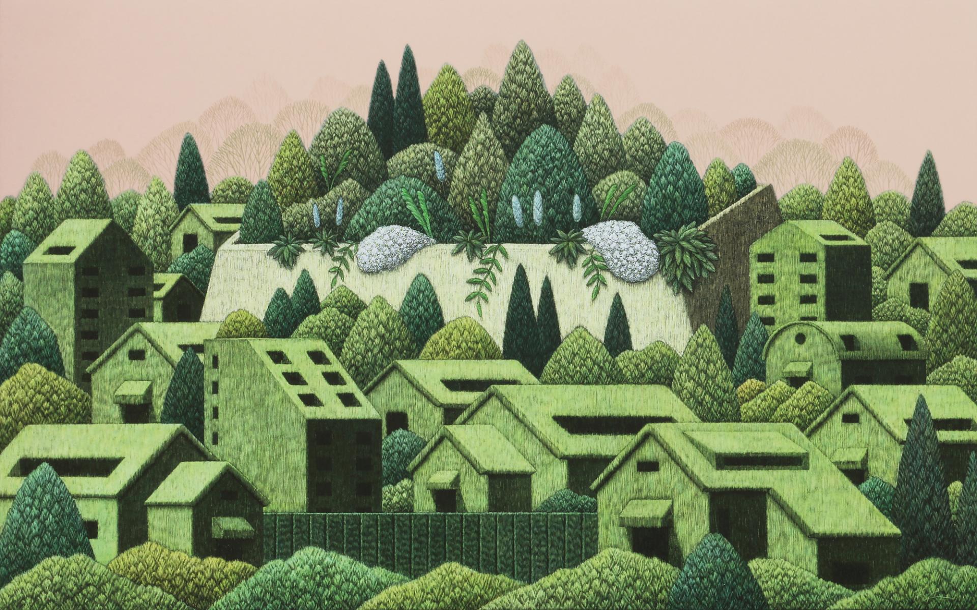한준호 | 도시정원 2507, 72.7x116.8cm, Mixed media(Scratched) on canvas, 2025