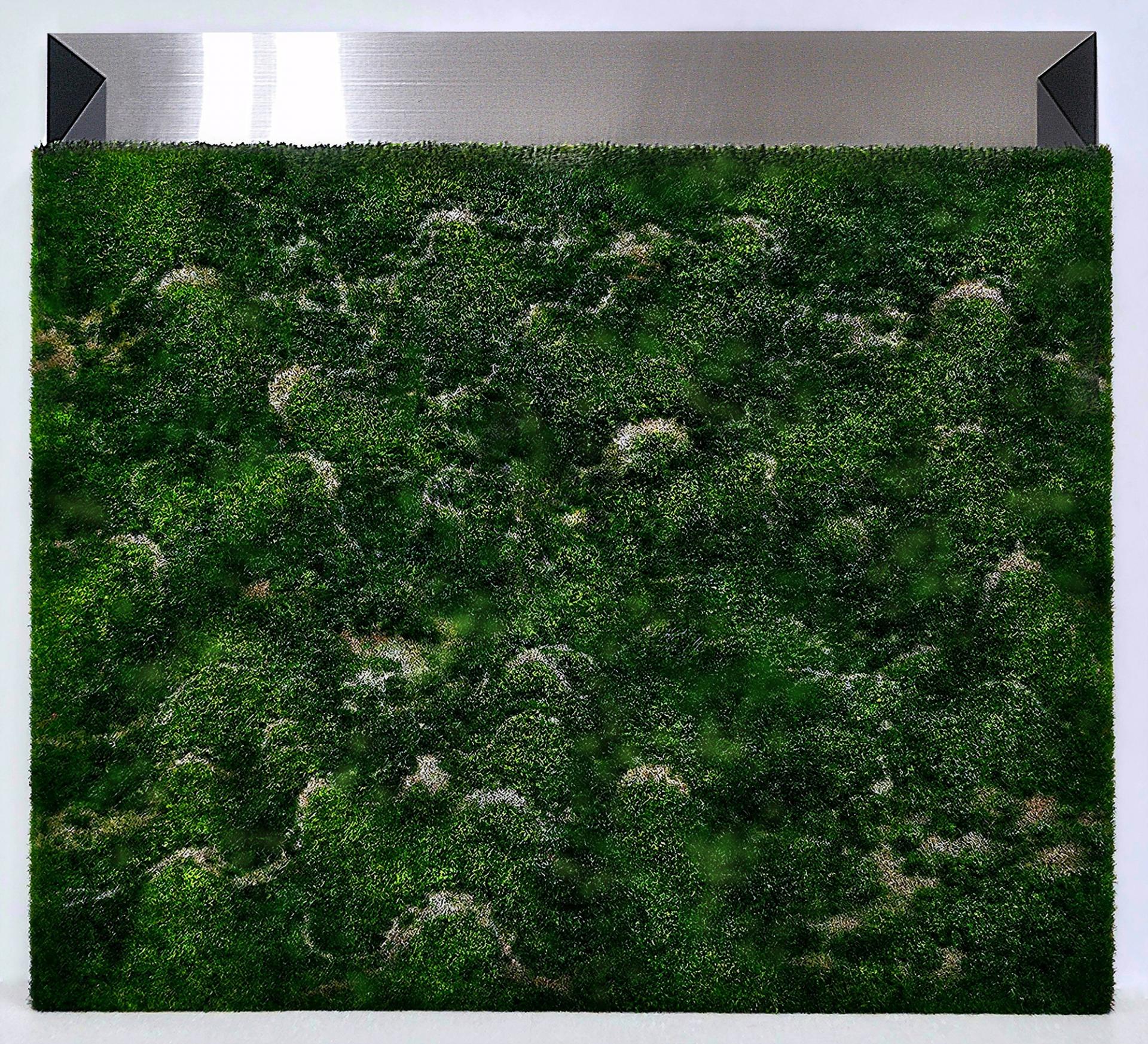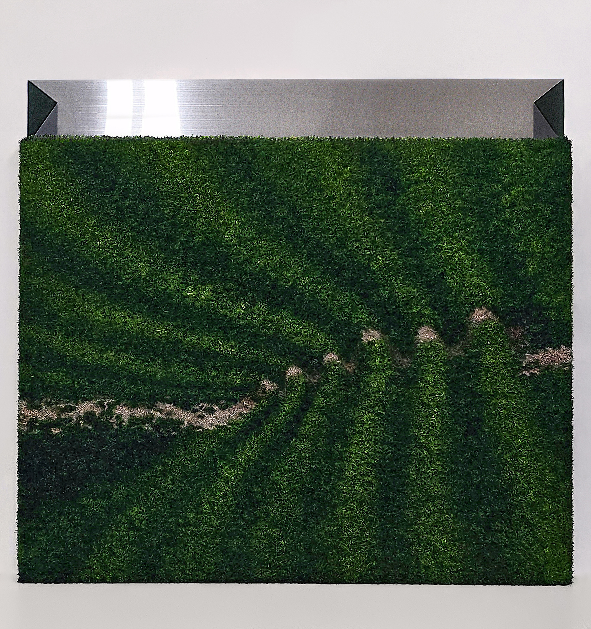 이번 전시 《소리 없는 노래》는 정해윤 작업 세계의 연장선에 놓이면서도, 한층 더 깊은 사유로 들어간다. 인간의 내면과 사회적 삶에 스며든 언어의 폭력, 그리고 그에 대한 저항과 치유의 서사이다. 특히 작가는 인조잔디라는 재료를 회화의 바탕으로 채택하며, 흔하고 하찮게 여겨지는 것들 속에서 예술적 가치를 끌어올리는 시도로 이어간다. 인조잔디는 매끄럽지 않고 불편하며, 예술의 전통적인 재료에서 벗어나 있지만, 바로 그 거칠고 다루기 힘든 표면 위에서 얹힌 정교한 이미지들은 누군가의 상처 입은 마음이 아름다운 목소리로 다시 태어나는 과정을 은유 한다.